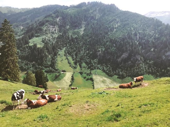 Chez M. Paul HETTEGGER, les génisses pâturent tranquillement à 1400 mètres d’altitude avant de monter à l’alpage entre 1600 et 2200 mètres ! Dans cet élevage très performant, les 20 vaches laitières produisent 12 500 litres en moyenne par an.