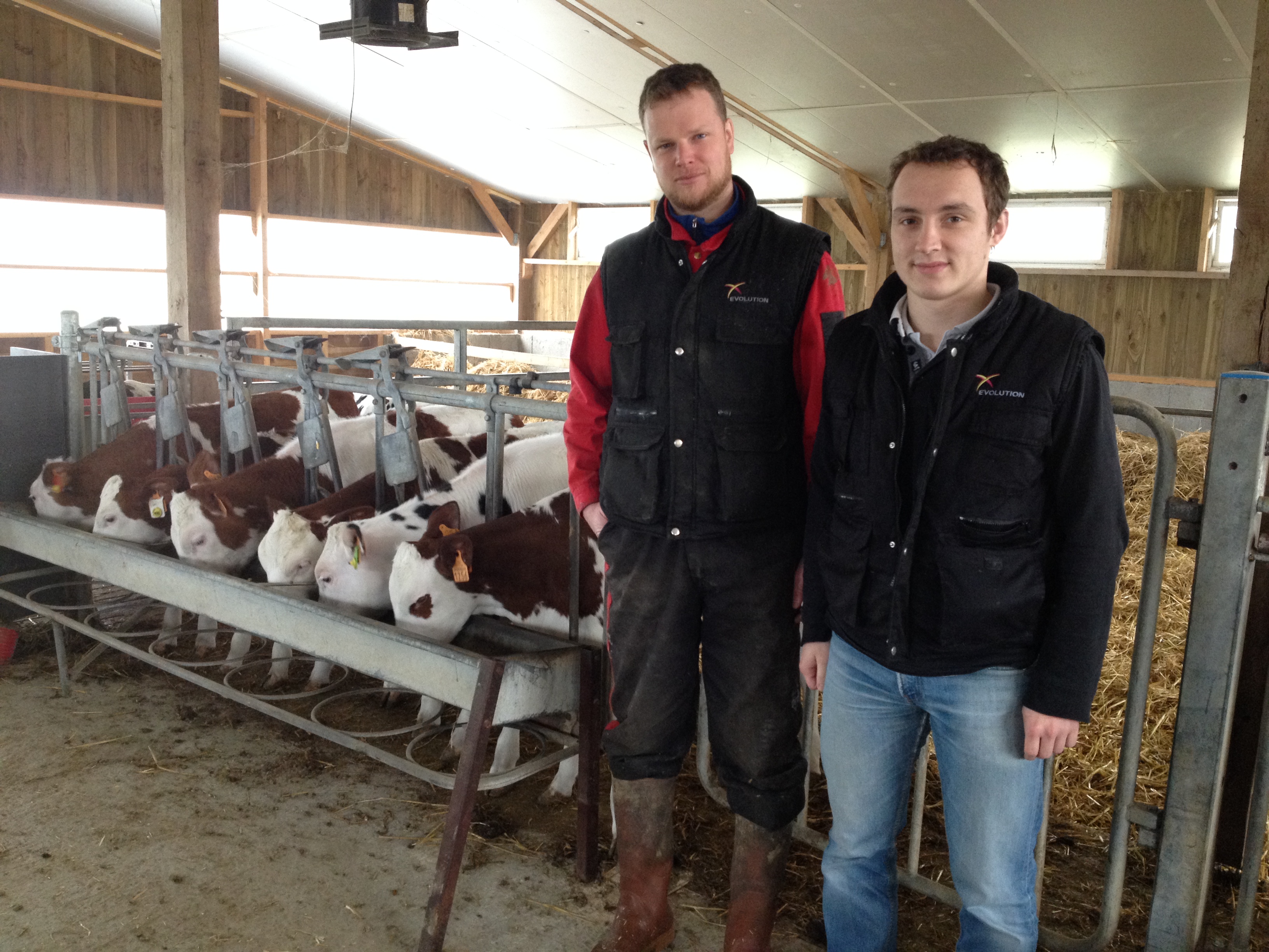 Vincent BIZON, associé au GAEC de la Bazinière (79) et son technicien Evolution, Bruno Ménétrier, dans la nouvelle nurserie. Pour Vincent, une phase de remise en question dans l’élevage des veaux a été nécessaire. « Une fois que l’on a compris qu’il ne fallait pas les contraindre, tout roule ! ».