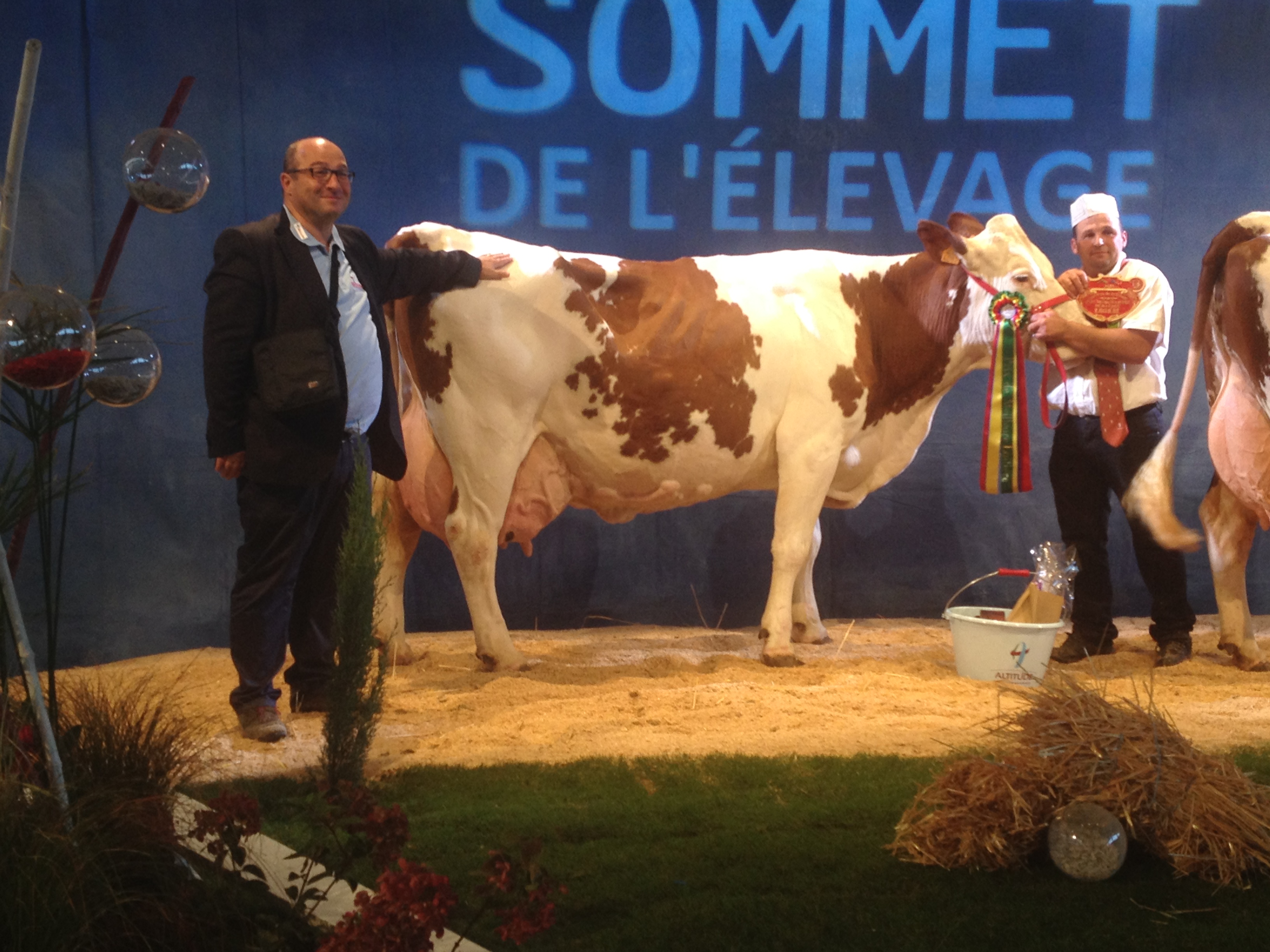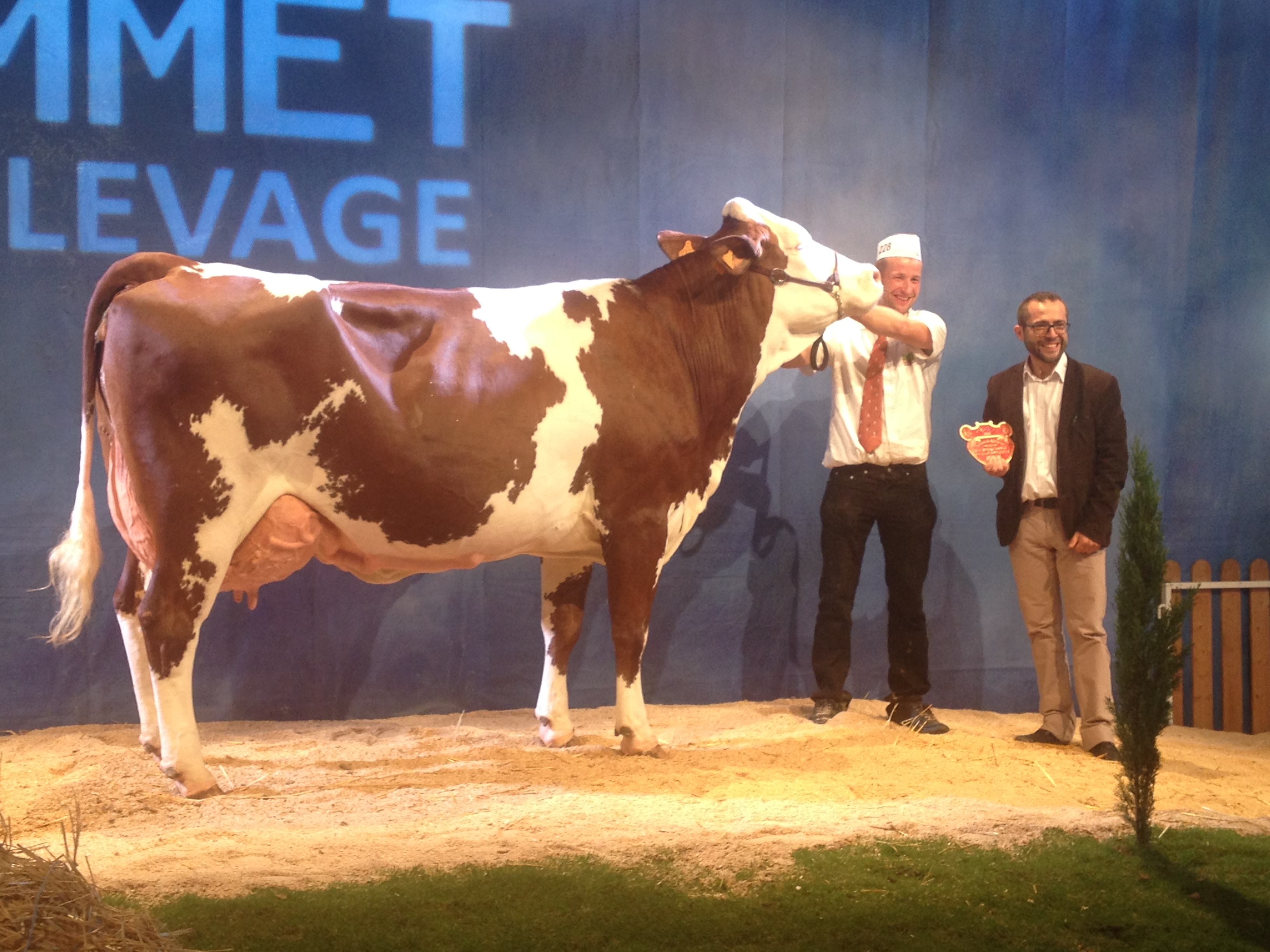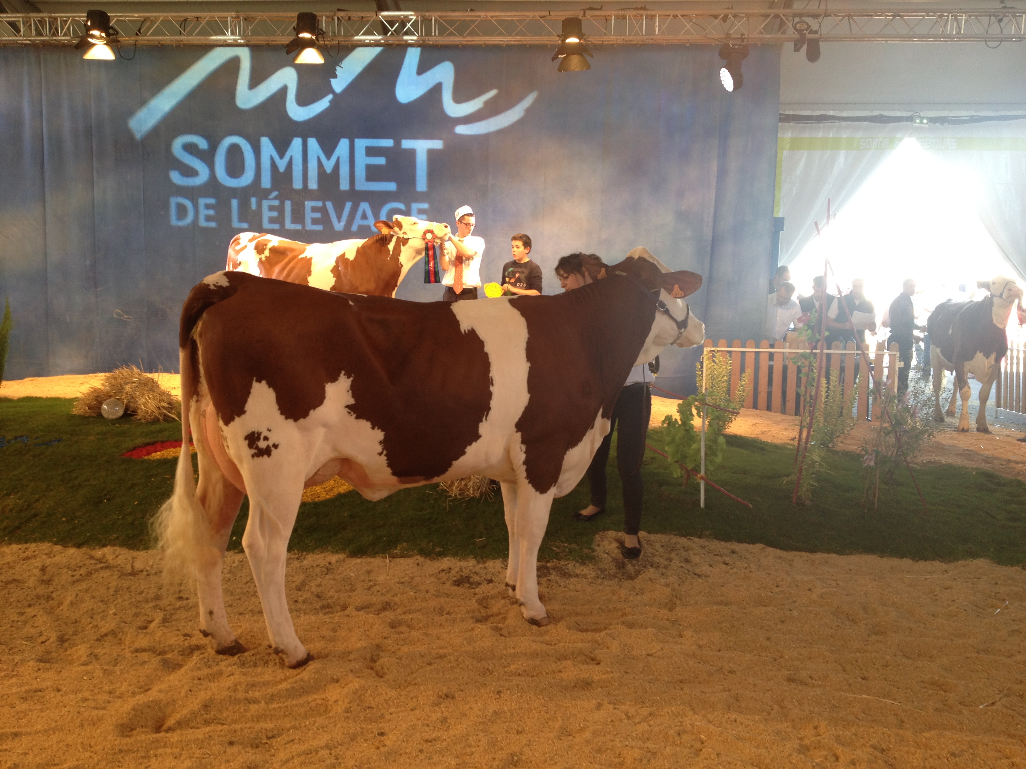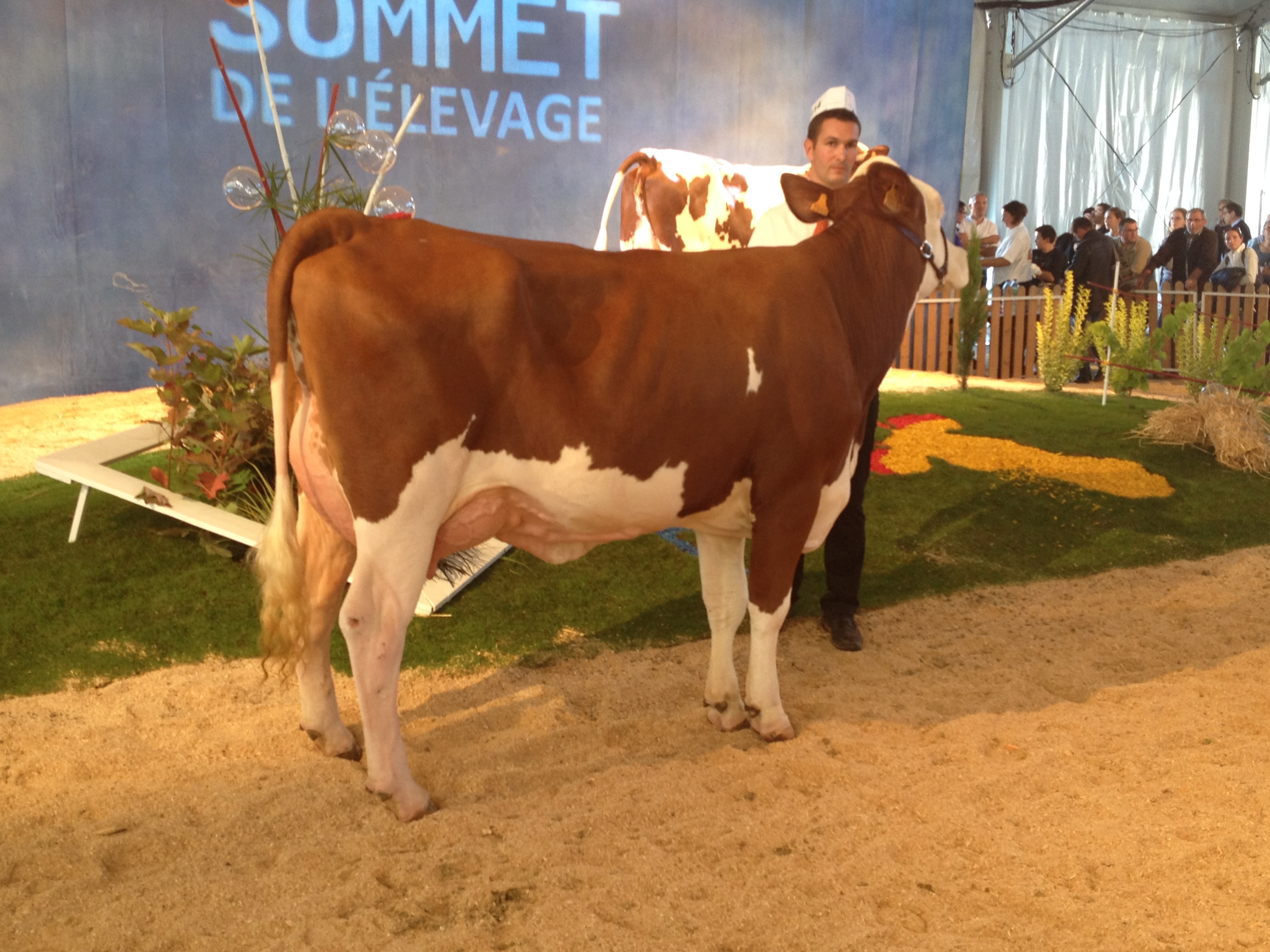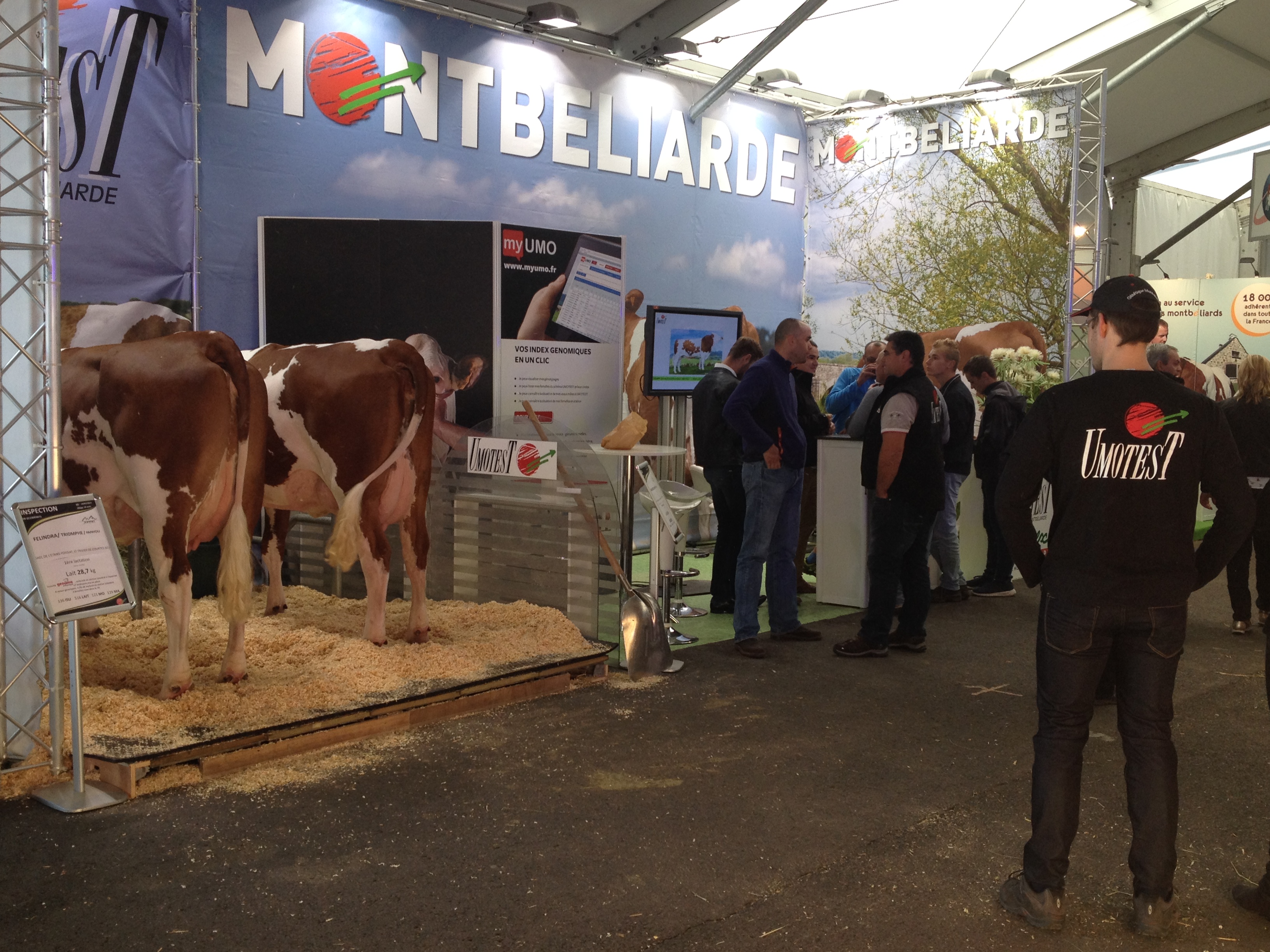 Le stand Umotest a cette année encore présenté deux vaches. La première, Inspection (Felindra/Triomphe) appartenant au Gaec de l’Etang Foissiat (01) est passée par la station femelle de Ceyzériat. Après 17 embryons de posés, déjà 4 mâles de génotypés et un fils de Joyland en station mâle ! Vêlée à 34 mois, elle est contrôlée à 28,7 kg de lait. La seconde, Illiade, du Gaec de la Vacheresse (42) est une fille de Guiluxe, vêlée à 25 mois et contrôlée à 32,4 kg de lait. Guiluxe est un taureau actuellement indexé à 728 en lait, 121 en mamelle dont 134 en hauteur d’attache arrière.