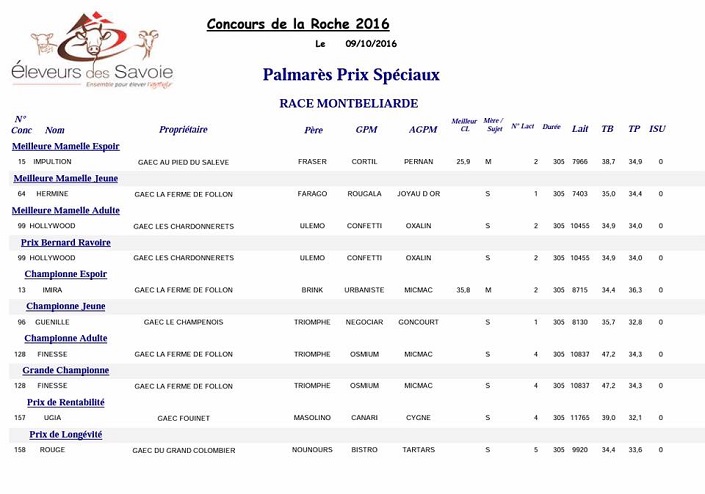 C'est un concours de grande qualité qui s'est tenu à La Roche Sur Foron le 9 octobre dernier. Finesse, une fille de Triomphe x Osmium au GAEC de la ferme de Follon s'est imposée comme grande Championne de cet interdépartemental des Savoie. Retrouvez le classement de cette manifestation ci-dessous.
