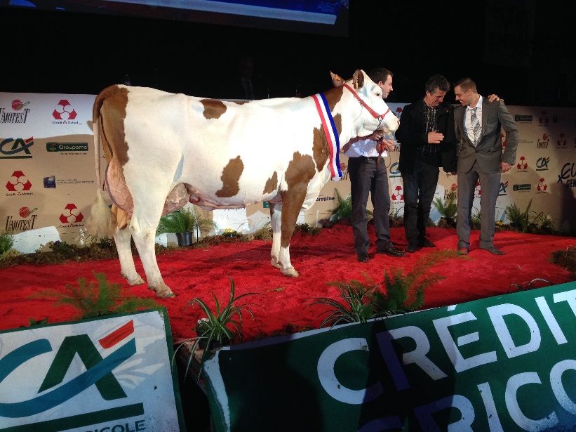 Esmeralda (Rougala/Linou) s’adjuge le titre de championne adulte et grande Championne Eurogénétique en race Montbéliarde pour l’édition 2015. Cette vache en quatrième lactation a produit 9711 kg de lait en 305 jours lors de sa troisième lactation à 48.7 de TB et 37.8 de TP. Elle appartient au Gaec Laprevote à Venisey (70).