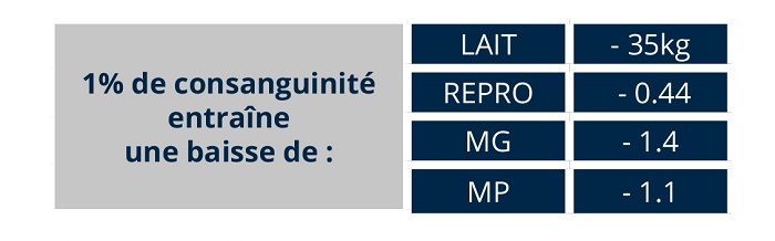 On estime le manque à gagner à -26€ par point de consanguinité par vache et pour l’ensemble de ses lactations. Elle est calculée en lisant directement le génome des deux individus. La parenté génomique est une meilleure prédiction de la consanguinité des produits à naître.