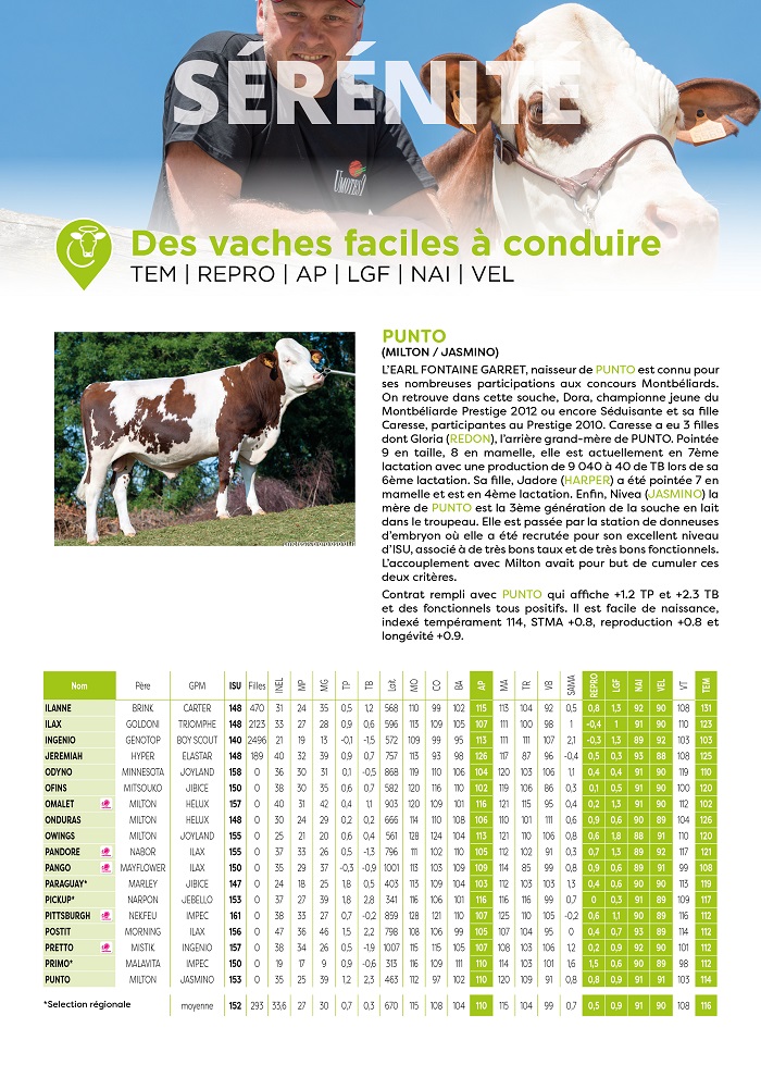18 taureaux ont été sélectionnes dont 5 disponibles en semence sexée avec en tête d'affiche, PUNTO un fils de MILTON qui affiche des taux et des fonctionnels tous positifs. PUNTO est facile de naissance, indexé tempérament 114, STMA +0.8, reproduction +0.8 et longévité +0.9.