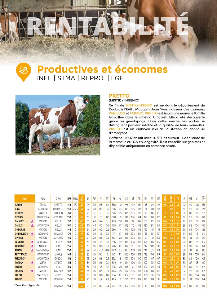 Suite à l'indexation de décembre 2020, retrouvez-les taureaux spécialement sélectionnés pour leur aptitude à générer des vaches productives et économes. 19 taureaux ont été sélectionnés sur les index INEL / STMA / REPRO / LGF avec en tête d'affiche, PRETTO un fils de MISTIK et +1007 en lait, +1.2 STMA, +0.9 en longévité.