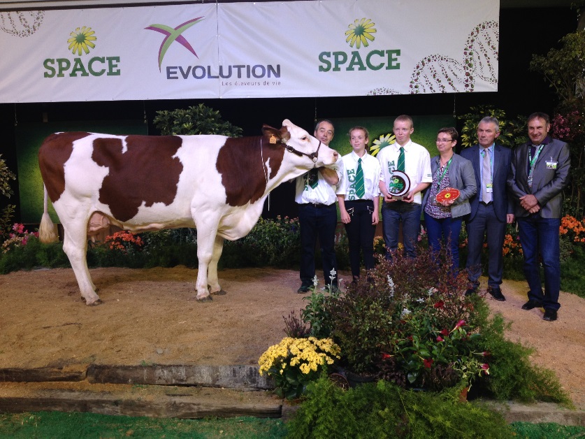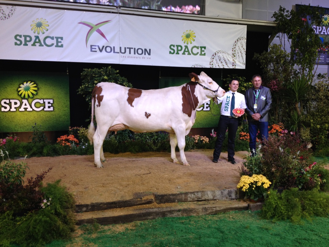 Fistuline (Urbaniste/Micmac) appartenant au GAEC de la Randouillère à Houssay (53), Grande Championne SPACE et Championne Adulte. Elle a produit 9 208 kg de lait en 2ème lactation à 38,8 de TA et 43,0 de TB.