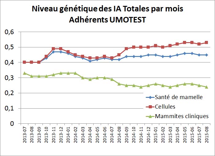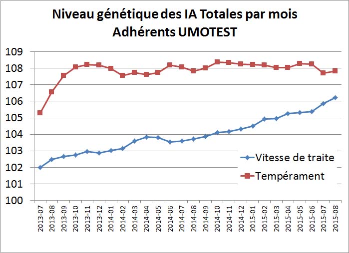 Le bilan génétique des inséminations sur ces 24 derniers mois voit les index vitesse de traite (VT) et tempérament (TEM) progresser. Cette hausse s’explique d’une part par l’attention portée par les éleveurs sur ces critères et d’autre part, par une disponibilité en taureaux Umotest améliorateurs sur la VT et le TEM. En effet, un effort important de sélection a été porté ces dernières années sur le recrutement des mères à taureaux, sur leurs accouplements et sur les choix génétiques de l’entreprise.